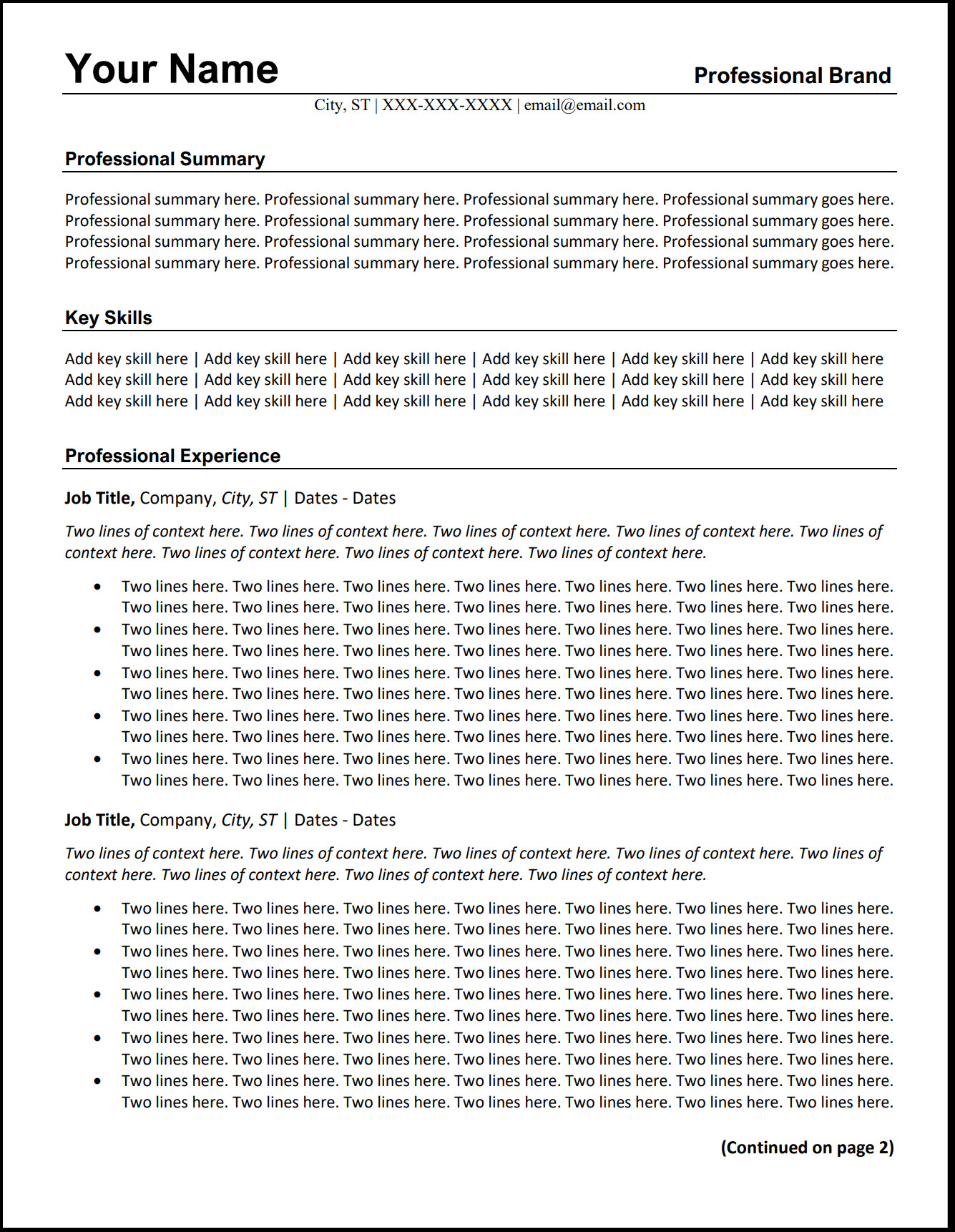This basic template is great for beginner resume writers. It's ATS friendly, includes basic branding elements, and can support an unlimited page count.